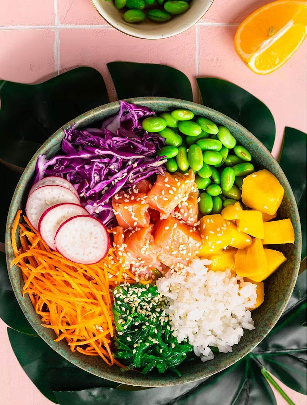 Riso basmati, salmone, edamame, ravanelli, mango, rucola€ 16,00