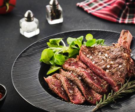 Tagliata di manzo alla griglia con sale grosso e rosmarino, servita con patate al forno e accompagnata da una delicata salsa tartara.€ 23,00